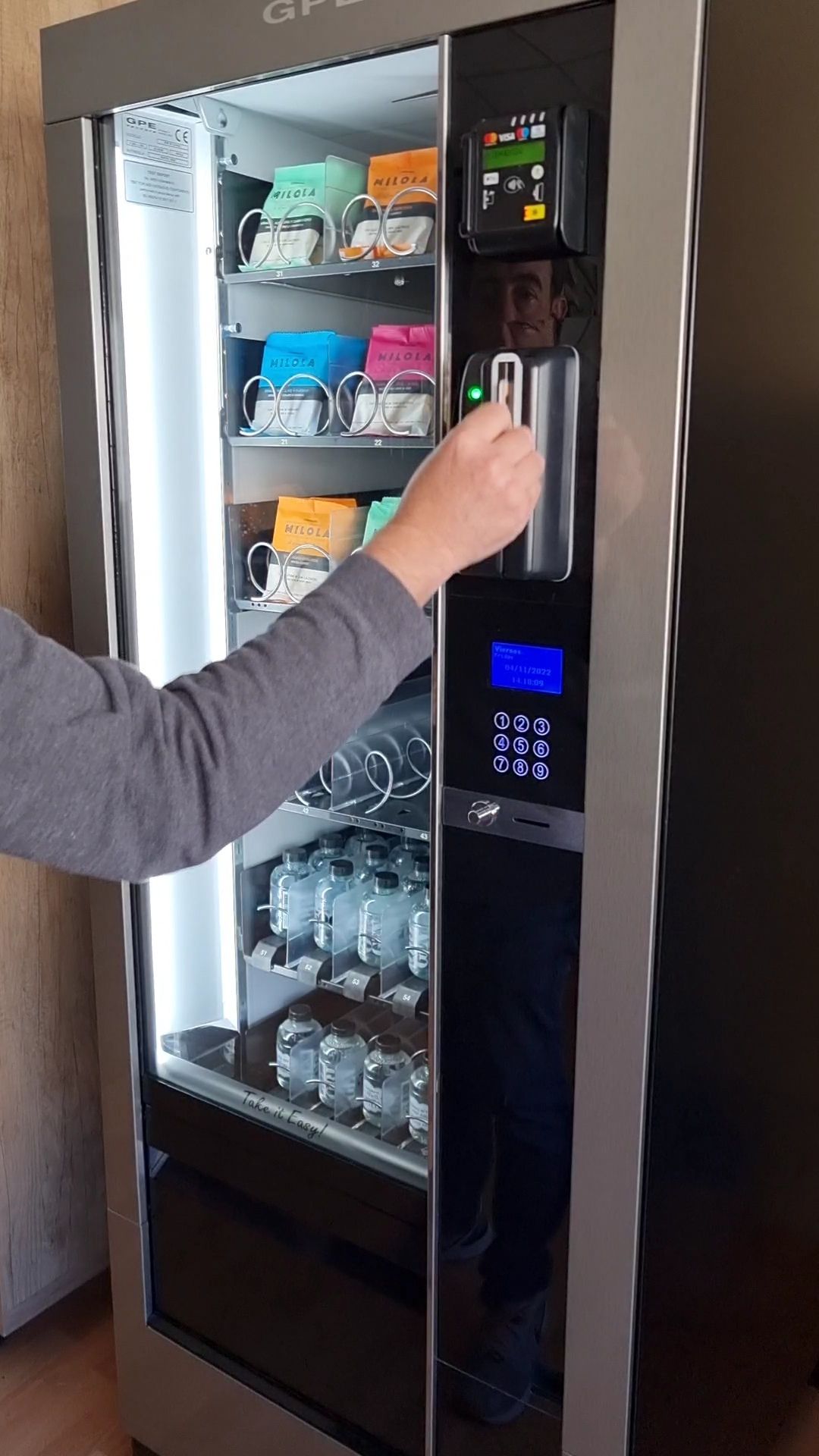 Máquinas par a productos frescos, pan, leche, huevos, carne y pescado, fruta y verdura, comida preparada, helados, productos congelados, botellas de cristal, etc.
